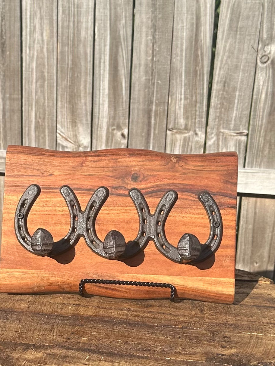 Discover the beauty and function of our Acacia Wood Triple Horseshoe Rack at Bikers And Beaches. Handcrafted, this rack combines rustic wood with three durable horseshoes, perfect for keys, towels, or gear.